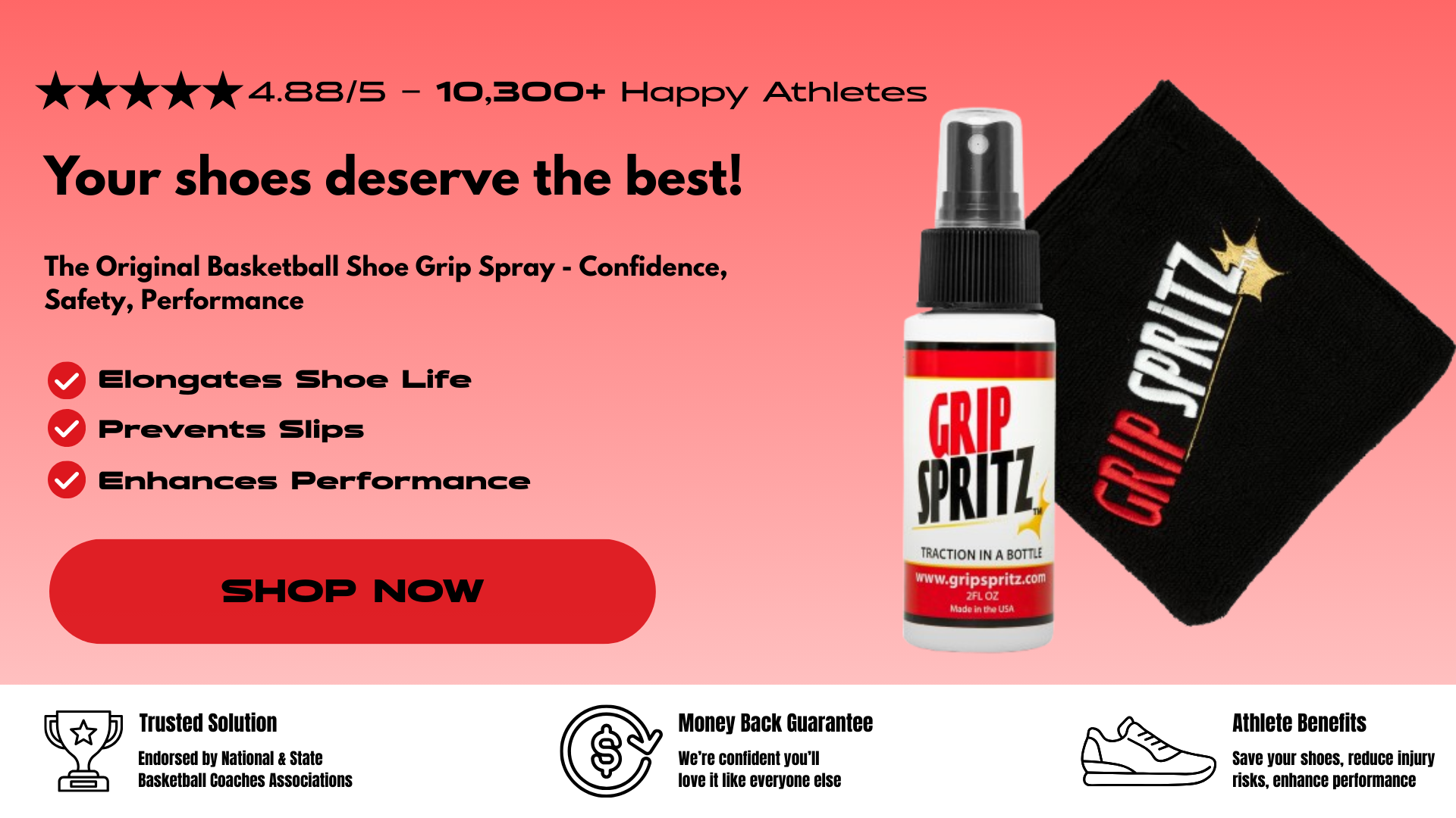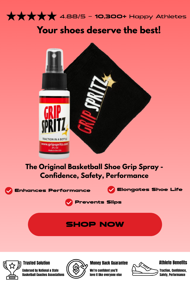 Grip Spritz is specially designed to instantly restore the traction of your basketball shoes. Spray the soles of your shoes, give them a quick wipe to remove dust and debris, and go hoop with more control and confidence! Grip Spritz enhances the grip of the shoes without making them sticky.